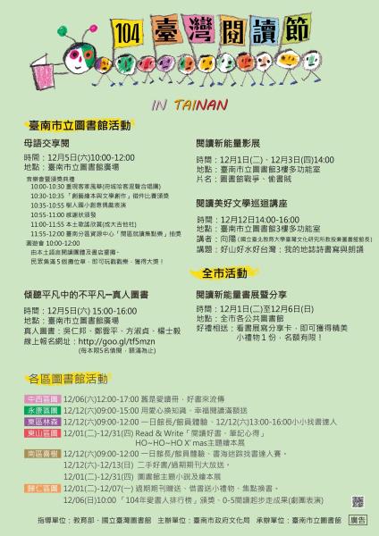 為滿足市民對閱讀的多元需求,特結合臺灣閱讀節,辦理閱讀新能量書展及影展、哈客混聲合唱、創意偶劇演出、本土歌謠欣賞、真人圖書借閱等多樣態的閱讀推廣活動,讓閱讀成為市民生活的一部分。